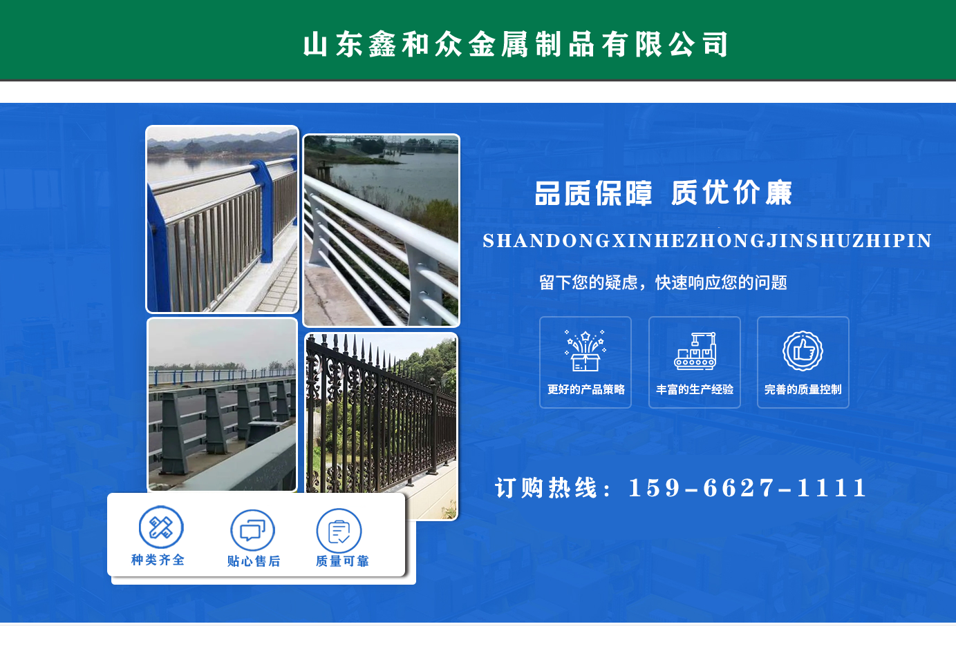 山東鑫和眾金屬制品有限公司主要產(chǎn)品有防撞護欄,橋梁護欄,道路護欄,河道護欄,不銹鋼護欄等護欄。提供設(shè)計方案,一站式定制,包您滿意價格優(yōu)惠,歡迎來電咨詢! 公司常年從事銷售護欄防撞護欄,橋梁護欄,道路護欄,河道護欄,不銹鋼護欄,橋梁鋼護欄,河道燈光護欄等。產(chǎn)品廣泛應(yīng)用于橋梁、河道、旅游景區(qū)、道路、公路、公園、小區(qū)、景觀、道路防撞等領(lǐng)域?! 」井a(chǎn)品均采用優(yōu)質(zhì)不銹鋼材料,符合相關(guān)標(biāo)準(zhǔn)。各種型號不銹鋼復(fù)合管及護欄,質(zhì)量嚴(yán)格把控。產(chǎn)品強度高、耐腐蝕、焊接牢固、抗沖擊、性能好,防撞護欄結(jié)構(gòu)簡單、美觀實用大方。 歡迎前來訂購!...